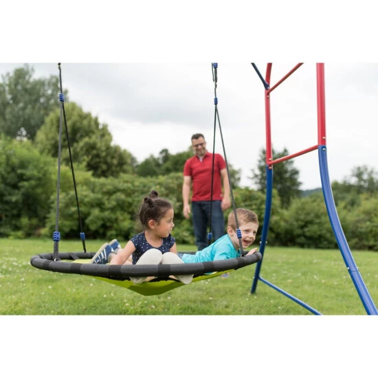 Für Sicherheit und Wetterfestigkeit des Nestes sorgen das besonders stabile Schaukelgestell und die Bodenverankerungen. Sogar hoch schaukeln lässt es sich ohne Risiko: Das in sich geschlossene Aufhängungssystem trägt ein Benutzergewicht von 120 kg.