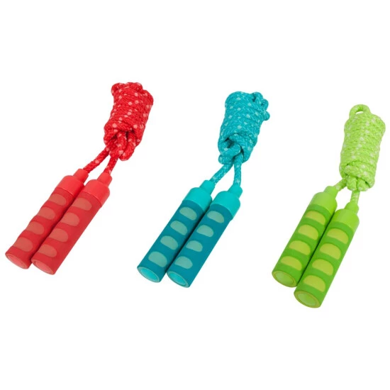 Gemustertes Springseil mit weichen Softgriffen für Kinder von HUDORA Artikel wird sortiert geliefert. Eine Vorauswahl von Farbe/Muster/Modell ist bei der Bestellung nicht möglich.: rot, grün, blau Achtung: Nicht für Kinder unter 36 Monaten geeignet wegen langer Schnüre. Strangulationsgefahr!